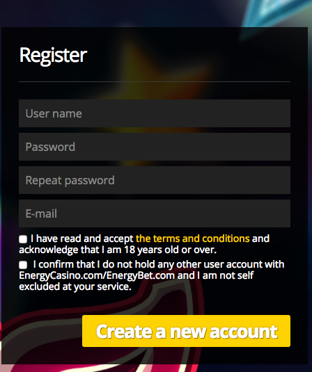 Registration at Energy Casino is made via a simple online form. Start off by picking your username and the currency you wish to deal in. Make sure you are happy with both, as these can’t be changed later! Confirm you are 18 years of age, and tick the box to accept that you have read and agree to the terms and conditions. Click submit and you’ll have instant access to your account. Make your first deposit and you’re ready to go.