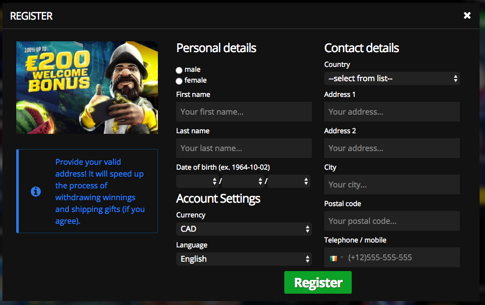The next form that pops up is where you fill in all your personal details and register your account. You need to include your name, address, country, gender, date of birth, currency, language, and mobile number. After this you click the “Register” button and you will be taken to your account where you can claim your welcome bonus and start playing all the great casino games and hopefully win plenty of jackpots too.
