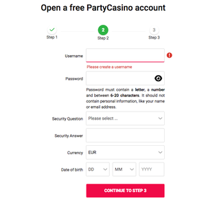 The second step is to choose your username and password. You also get to pick a security question, choose the currency you want to play in, and fill in your date of birth. Once completed, click “Continue to Step 3” to finish registering for an account.