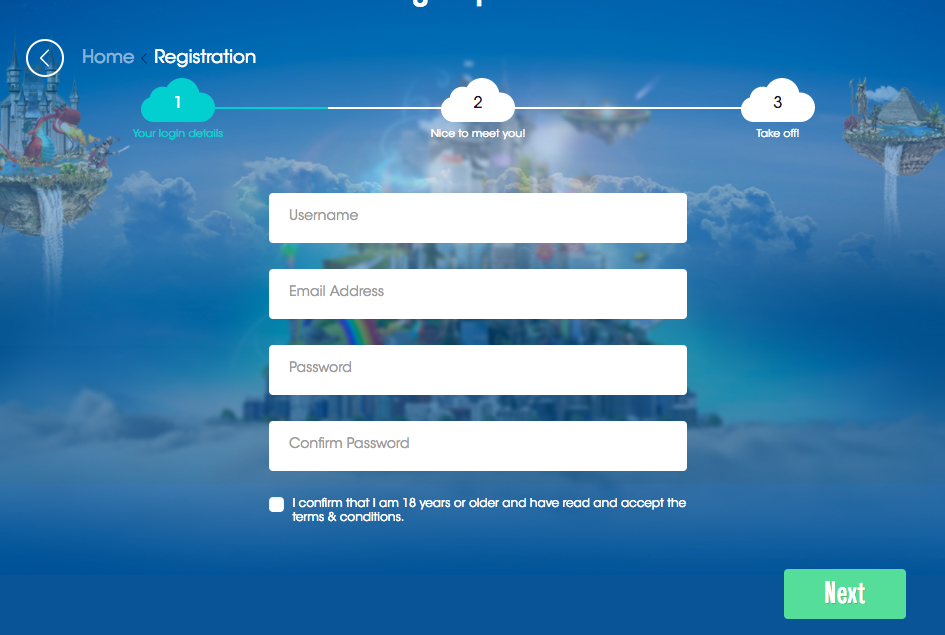 Clicking the “Join Now” button will start the three step sign up process and the first form requires you to create a username, fill in your email address, and create a password. You will also have to confirm that you are over 18 and that you accept the terms and conditions before you click the “Next” button.