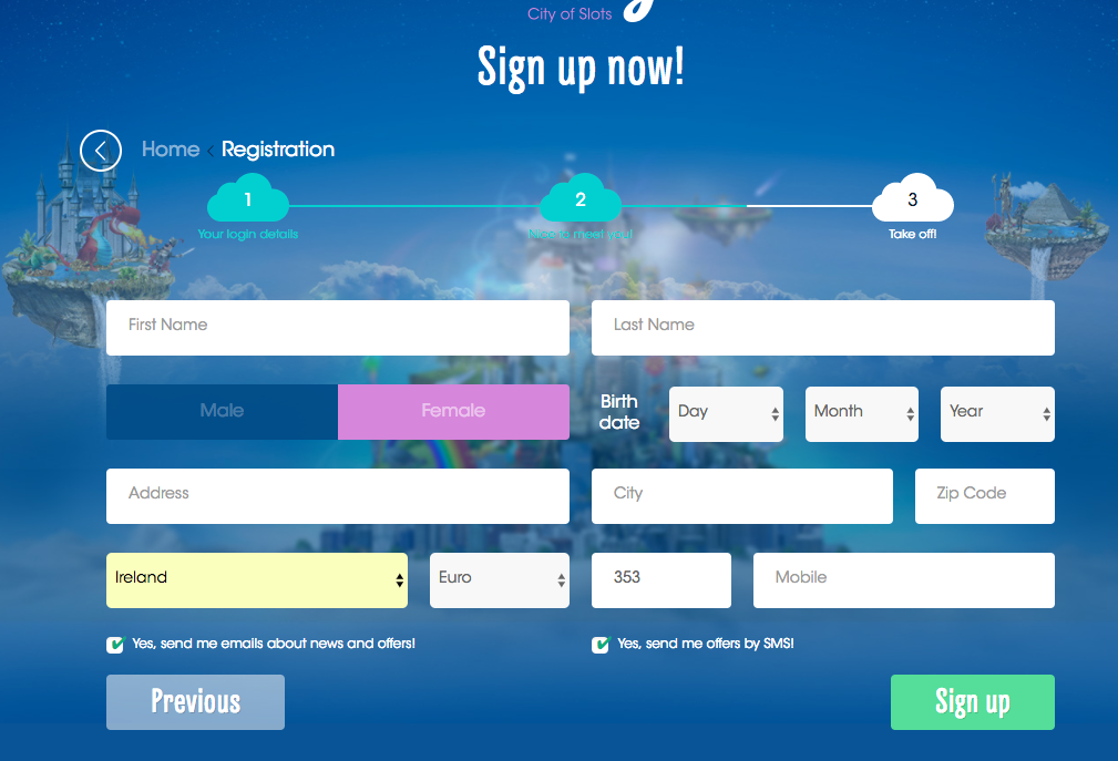 The next form is where you fill in all your details. This includes your name, gender, date of birth, address, country, currency, and mobile number. You can also click the boxes to receive emails about special offers. There is a second box too where you can receive offers by SMS. Once you fill this in, click the “Sign Up” button and you will be taken to the cashier section. Here you make your first deposit, claim the sign up bonus, and start playing the casino games you want to play.